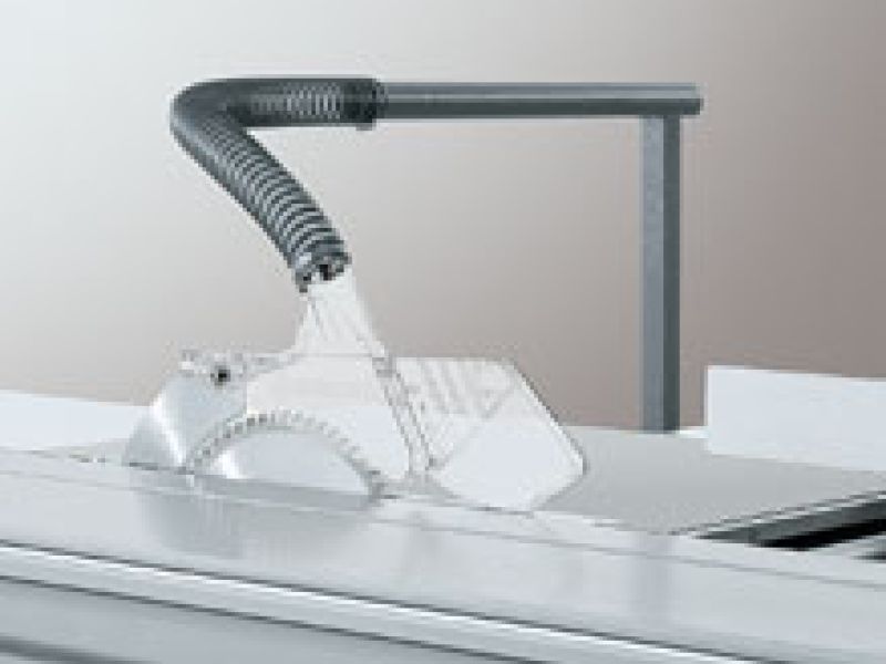 Die PSV wird mit einer schmalen Haube für 90°-Schnitte und einer breiten Haube für Gehrungs-Schnitte geliefert. Sie decken sowohl das Haupt- als auch das Vorritzsägeblatt ab. Die Haube lässt sich auf die jeweilige Materialstärke stufenlos und selbsthemmend einstellen. Absauganschluss: 80 mm